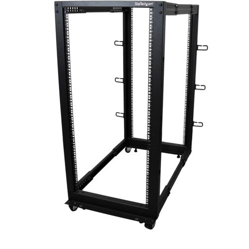 StarTech.com 4POSTRACK25U. Typ: Freistehendes Gestell, Rack-Kapazität: 25U, Höchstgewicht (Kapazität): 544,3 kg, Verbessertes Kabelmanagement, Fahrrolle. Gewicht: 33 kg. Produktfarbe: Schwarz